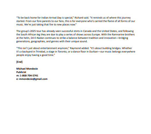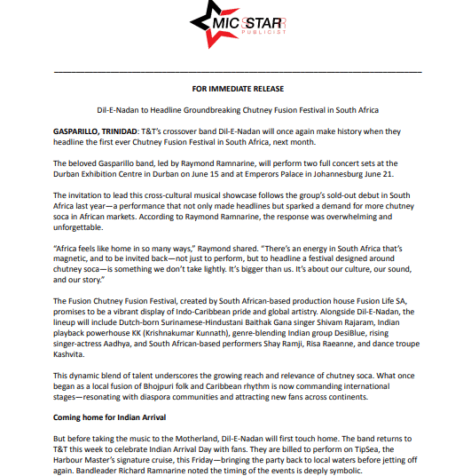 According to a release from the band, the group led by Raymond Ramnarine, will perform two full concert sets at the Durban Exhibition Centre in Durban on June 15 and at Emperors Palace in Johannesburg June 21.