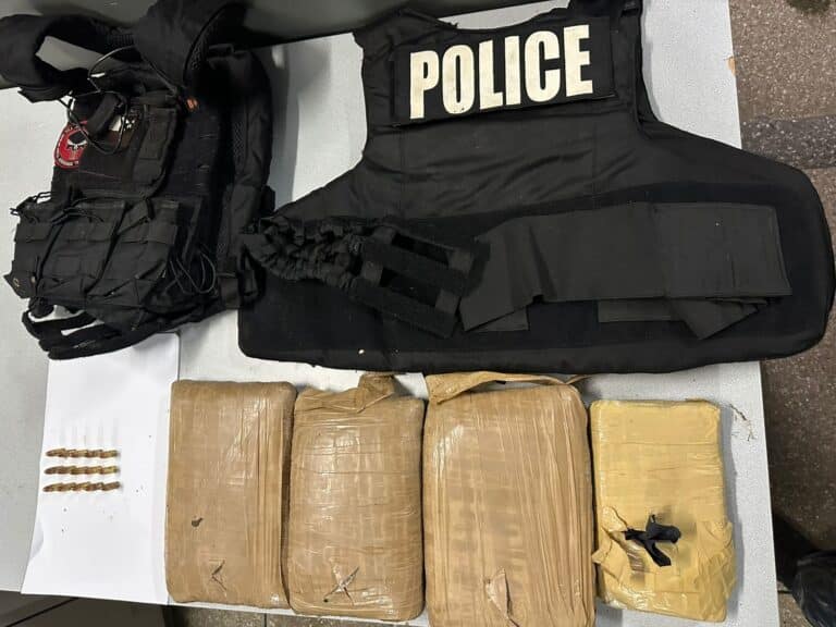 In the Central Division, IATF officers conducted an exercise between 4 pm and 9:30 pm on June 26th, 2025, in the Enterprise district. During the exercise, officers searched a bushy area at Chrissie Terrance, which resulted in the discovery of two bulletproof vests, 4.1 kilogrammes of cannabis, and 15 rounds of ammunition.